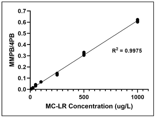 Calibration curve of MC-LR concentrations versus MMPB to 4-phenylbutryic acid (4PB) ratio.