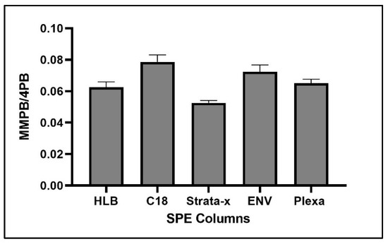MMPB yield from MC-LR spiked water using five different SPE columns. Each bar represents an average of three samples. Error bars are standard deviations.