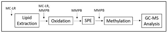 Depending on the form of MCs, free or covalently bound, there are different types of methods used to detect MCs. MCs are typically extracted from water samples by lysing the cyanobacterial cells and extracting MCs with a solvent such as methanol. The extract may be analyzed via multiple analytical methods including enzyme-linked immunosorbent assay (ELISA), protein phosphatase inhibition assay (PPIA), and liquid chromatography–mass spectroscopy (LC–MS). However, with solvent extraction, the bound fraction of MCs is often not accurately measured by PPIA, LC–MS, or ELISA [19,35,36]. To accurately quantify bound MCs, an oxidant (usually in the form of potassium permanganate or ozone) is used to cleave the double bond on the Adda moiety, the 5th amino acid of the heptapeptide MC structure, releasing 3-methyl-2-methoxy-phenylbutyric acid (MMPB) [37] (Figure 1). MMPB can then be quantified using gas chromatography–mass spectroscopy (GC–MS) or LC–MS to indirectly determine the concentration of total MCs [38]. To date, there are more than 100 characterized MC congeners [39]. However, there are a limited number of commercially available MC congener standards and total MC concentration is often underestimated. The MMPB method identifies a moiety which is present on all MC congeners and is, therefore, the most effective method of estimating total MC concentration. Techniques used in biomonitoring of MCs commonly evaluate only the unbound fraction; therefore, total MC concentration could be drastically underestimated in many assessments. The covalently bound fraction of MCs often represents a large portion of MCs found in the environment. Bound MCs may have toxicities that are approximately an order of magnitude less than free MCs, yet they are sometimes detected at levels multiple orders of magnitudes more than free MCs [19]. For example, a report analyzing dungeness crab larvae, Metacarcinus magister, found the covalently bound concentration of MCs to be 10,000 times the concentration of unbound MCs [19].