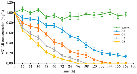 The original bacterial community (sample G0) in the sediment was repeatedly treated with 1 mg/L MC-LR under anaerobic conditions. Sample G1, sample G2, and sample G3, were collected from the experimental system, after 1 week, 2 weeks, and 3 weeks of incubation, respectively. The ability to degrade MC-LR by the continuously treated bacterial community was assessed by measuring the toxin residues in the culture system (Figure 1). In all treatments, the degradation increased as incubation time increased. Sample G3 had the maximum average degradation rate of 0.33 mg/L/day, followed by sample G2, sample G1, and sample G0 of 0.22, 0.18, and 0.12 mg/L/day. The degradation rates of MC-LR increased with toxin addition, as indicated by the decrease in the time required for complete degradation of MC-LR. Successive addition of MC-LR accelerated the degradation ability to nearly three-fold than that of the natural bacterial community during three weeks of incubation. As shown in Figure 1, MC-LR was degraded immediately by all samples without any lag phase, once the toxin was added into experimental system. In the entire degradation process, the degradation rates of MCs were decreased with the decline of the toxin concentration remained in culture system. It was observed that the control group without the addition of the bacterial community did not degrade at all times (Specific values of MC-LR concentration can be seen in Table S1).