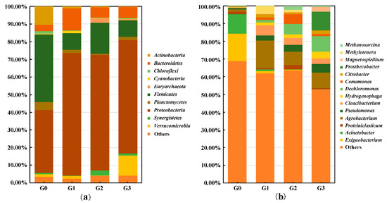The composition of the bacterial community was obtained through 16s rRNA high-throughput sequencing. A total of 43 phyla were annotated among all samples, and 10 phyla whose relative abundance was higher than 1.00% in at least one group were selected for comparison (Figure 4). As shown in Figure 4a, in group G0, Firmicutes (38.11%), Proteobacteria (35.44%), and Actinobacteria (10.51%) were the main phyla, accounting for 84.06% of the total relative abundance. In group G3, the dominant phyla were Proteobacteria (64.16%), Verrucomicrobia (11.36%), and Firmicutes (9.41%), which accounted for 84.94% of the total bacteria. The relative abundance of Proteobacteria increased nearly twofold during the first incubation from group G0 to group G1, and then remained consistently high. However, the relative abundance of Firmicutes maintained a general declining trend, and that of Actinobacteria decreased continuously during the entire process. It should be noted that the abundance of Verrucomicrobia rapidly increased from group G2 to group G3.