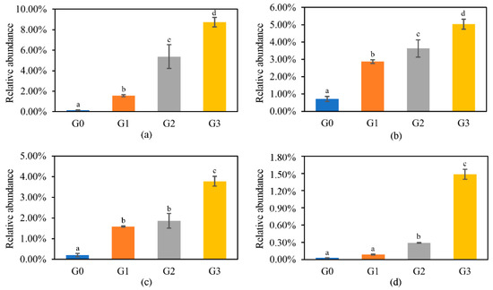 DNA of samples G0, G1, G2, and G3, collected at 0, 7, 14, and 21 days, were extracted according to a previously reported method [39]. The V3–V4 region of 16S rDNA was then amplified using the specific primers with barcodes 341F (5′-CCTACGGGNGGCWGCAG-3′) and 806R (5′-GGACTACHVGGGTATCTAAT-3′). The amplification products were separated by electrophoresis on a 2% agarose gel, and the target amplicons were collected using a DNA gel extraction kit (Axygen, CA, USA). These purified amplicons were mixed equivalently to construct a library for further sequencing by Illumina Hiseq 2500.