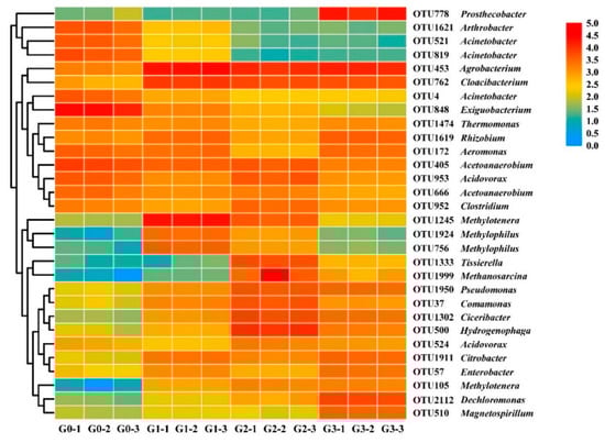 The 30 greatest operational taxonomic units (OTUs) at the genus level were selected for heatmap. There were four types of variation trend pertaining to the relative abundance of bacteria, which can be observed from the cluster analysis (Figure 6); (1) the relative abundance of Arthrobacter (OTU1621), Acinetobacter (OTU521, OTU819, and OTU4), and Exiguobacterium (OTU848) decreased; (2) the relative abundances of Tissierella (OTU1333), Methanosarcina (OTU1999), Pseudomonas (OTU1950), Comamonas (OTU37), Ciceribacter (OTU1302), Hydrogenophaga (OTU500), Acidovorax (OTU524), Citrobacter (OTU1911), Enterobacter (OTU57), Methylotenera (OTU105), Dechloromonas (OTU2112), and Magnetospirillum (OTU510) increased overall; (3) from OTU1474 to OTU952, the relative abundance remained comparably high in all samples; (4) the relative abundance of Methylotenera (OTU1245) and Methylophilus (OTU1924 and OTU756) increased from group G0 to group G1, then gradually declined. In addition, Agrobacterium and Cloacibacterium were maintained at high levels of relative abundance after the rapid increase from group G0 to group G1. Prosthecobacter maintained an extremely low percentage from the original bacterial community to group G2, while a sudden increase occurred during the incubation from group G2 to group G3, which explained the changes in Verrucomicrobia at the corresponding time.