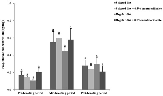 Sex hormones function to promote the maturation of animal sexual organs and maintain secondary sexual characteristics. Typically, the ovary of the female bird is the primary secretory organ of sex hormones, and secretes estrogen (estradiol and estrone) and progesterone. The testes of male animals are the primary secretory organs of androgens and secrete testosterone. Therefore, we monitored these hormones to gain a better understanding of animal gonad function [42]. Many studies have shown that mycotoxins adversely affected the gonads of animals [14,43,44]. In this study, the courtship and mating behaviors of the red-crowned crane in the regular diet group were significantly reduced in the pre- and post-breeding periods. Concomitantly, we observed a significant decrease in testosterone levels in the males in the regular diet group during these two periods. Because reproductive behaviors such as courtship and mating are significantly associated with sex hormone levels [45,46,47], these results suggest that contaminants in the regular diets affect the gonads of the male animals [43], leading to decreased sex hormone secretion [48,49]. Moreover, contaminants in the diet may have affected other hormones and their functions, such as non-steroidal hormones [50]. Under the combined action of such hormones, the reproductive behavior of these animals was somewhat abnormal. However, because of the adsorption of harmful substances by montmorillonite, these reproductive behaviors and hormone levels in the regular diet + 0.5% montmorillonite group returned to levels similar to those in the selected diet group.