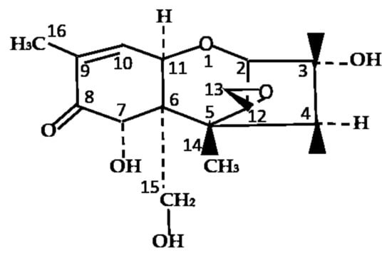 - Grove, J.F. Phytotoxic compounds produced by Fusarium equiseti. Part 7. Reactions and rearrangement of the 7-hydroxy-12, 13-epoxytrichothec-9-en-8-one skeleton. J. Chem. Soc. Perkin Trans. 1985, 1, 1731–1736. [Google Scholar] [CrossRef]
