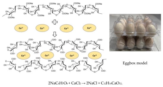 Sodium alginate (SA) is a natural gelling agent derived from the cell wall of Sargassum or Turbinaria brown algae [16]. SA is a polymeric flocculant with high adsorption capacities. It can interfere with many crosslinkers such as calcium(II) [17] and N,N’-methylenebisacrylamide (MBA) [18]. When SA crosslinks with calcium, a large amount of water is adsorbed and locked into the “eggbox” internal structure to generate a stable hydrogel; “eggbox model” (Figure 2). Carboxymethyl cellulose (CMC) is a derivative of cellulose and is formed by the reaction of cellulose with sodium hydroxide and chloroacetic acid [19]. As part of its macromolecular chain structure, CMC has many active groups, such as hydroxyl and carboxyl groups [20]. It is widely used in detergents, textiles, paper, foods, oil well drilling operations, and other industries as a thickening agent and flocculant [21,22]. Microspheres for SA/CMC-Ca can be prepared by two methods: extrusion and emulsification [23,24], and they are widely used for heavy metal removal from aqueous solutions [25]. However, there is a dearth of information on the use of SA/CMC for mycotoxin removal.