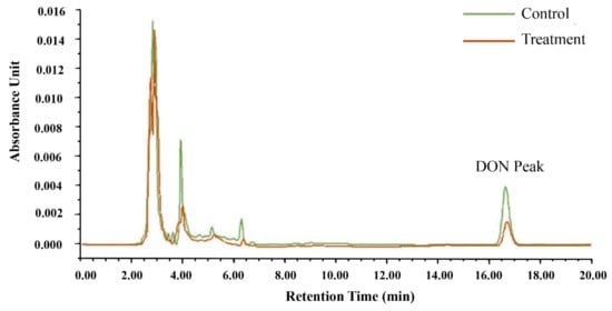 DON in cleaning water is also a severe problem for the ecosystem. We found that DON was degraded in water for 1 h in an alkaline environment at 70 °C. This alkaline degradation of DON was similar to that observed in a previous study with alkaline-degraded DON by heat treatment with 100% detoxification [37], which implied that DON had undergone structural changes in an alkaline environment and the reaction was accelerated by the high temperature. Similar work also found that DON decreased from 4.46 μg/g to 1.27 μg/g in the process of making tortillas from corn, which could be attributed to Ca(OH)2 treatment [38]. The safety of the degradation products of DON under alkaline conditions is also a concern. Five degradation products, namely, isoDON, NorDON A, NorDON B, NorDON C, and DON lactone, were isolated after harsh thermal or alkaline treatment of DON [37,39,40]. These degradation products were less cytotoxic compared to DON in an immortalized human kidney epithelial cell (IHKE) culture assay, in which DON revealed a median effective concentration (EC50) at approximately 1.1 mol/L, whereas NorDON A, B, and C did not exert any significant effect up to 100 mol/L [41]. In fact, we still think that alkaline and thermal degradation of DON is not the best method because of the difficulty of treating alkaline wastewater and the high cost of high temperature. Further, biodegradation of DON in water by the bacterium Devosia degradation is underway in our lab.