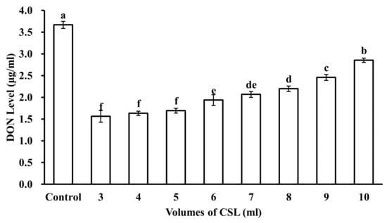 DON level in different volumes of CSL reacted with 5 mL microspheres. Control is DON level in original CSL. Values represent the means of three replicates and their standard errors. Different letters indicate significant differences between treatments (p < 0.05).