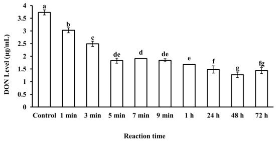 DON level in CSL after reaction with microspheres at different reaction times. Values represent the means of three replicates and their standard errors. Different letters for a, b, c, d, e, f, g indicate significant differences between treatments (p < 0.05).