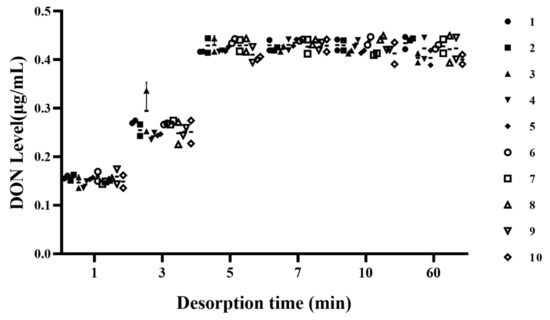 Deionized water was used to regenerate the microspheres after reacting them with DON-contaminated CSL, and the effect of desorption time on DON levels in the water was investigated. For microsphere desorption, the best desorption time was studied by testing DON levels in deionized water (Figure 6). The level of DON in water varied between 0.40 and 0.45 μg/mL for desorption times of 5 min or more, and the concentration of DON fluctuated at 0.1–0.2 μg/mL and 0.2–0.3 μg/mL, when the desorption times were 1 min and 3 min, respectively. When microspheres are kept for a long duration of time in deionized water, there are more chances that the microspheres will break. Therefore, 5 min was the best time to remove an adequate concentration of DON from microspheres.