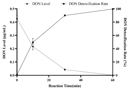 To avoid the contamination of environment caused by DON in contaminated water, an alkaline and high-temperature environment was created for the degradation of DON in contaminated water. In Figure 7, the results showed DON detoxification rates up to 48.83%, 80.45%, and 98.67% for the different reaction times of 10 min, 30 min, and 60 min, respectively. Therefore, DON could be removed from contaminated water, which would not lead to environmental pollution after discharge.