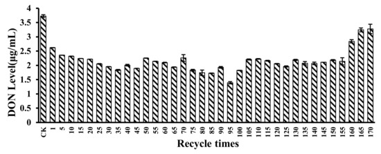 DON level in CSL after reaction with microspheres for 170 recycling times. The DON level in CSL was 3.73 μg/mL for the control. Values represent the means of three replicates and their standard errors.