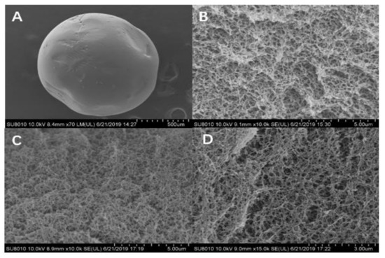 Different states of microspheres (1 g) were prepared and cleaned twice in water. After cleaning, 3 mL ethanol in water (7:3 v/v) was added and the microspheres were fixed for 24 h. After this, samples were gradient-eluted in 70%, 80%, 90%, and 100% ethanol, each for 10 min. The samples were then dried on a Leica EM CPD030 automated critical point dryer (Leica Microsystems Inc, Wetzlar, Germany). Ultrathin sample sections were prepared using an ultramicrotome (Leica EM UC6) (Leica Microsystems Inc, Wetzlar, Germany). The surface morphology was observed using a HITACHI SU8010 scanning electron microscope (Hitachi High-Technologies Corporation, Tokyo, Japan).