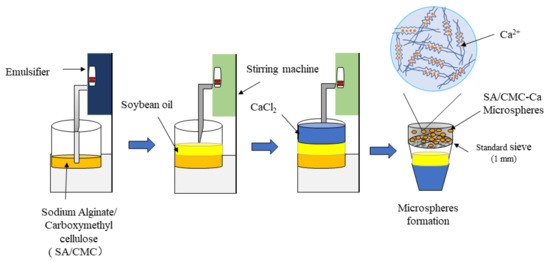 The gelation buffer consisted of 20 g SA and 6 g CMC, mixed in 1 L deionized water (Ming Che Water Purification System; Merck Millipore, China). An emulsification process for preparing microspheres is shown in Figure 11. The solution was stirred with the emulsifier (Fluko FM200 Fluko Technology Development Co., Ltd., Raleigh, NC, USA) for 30 min until completely dissolved. After this, the solution was mixed and stirred with 2 L of soybean oil in a dispersing mixer (ESJ-500 ELE Mechanical & Electrical Equipment Co., Ltd., Shanghai, China) for 1 min at 11 rpm. Then, CaCl2 solution for 2L (2L deionized water + 40 g CaCl2) was added and stirred at 5 rpm for 1 h. After that, deionized water was used to clean microspheres three times and 1L of deionized water was used every time for cleaning. After each time, microspheres were sieved by cotton yarn. [48]. After the microspheres were collected, they were weighed up to 5 g each for downstream analyses.