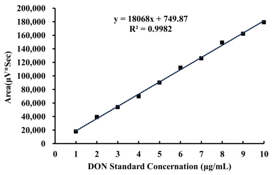 DON was detected according to a previously reported method [49]. Acetonitrile in water (1:9, v/v) mobile phase was prepared and used for high-performance liquid chromatography (HPLC) (Waters, Milford, MA, USA) on a C18 column (150 mm × 4.6 mm, 5 μm; Agilent Technologies, Santa Clara, CA, USA). A UV detector (Waters, Milford, MA, USA) was set at a wavelength of 220 nm, and the running time was determined as 20 min. Stock standard solutions of DON at concentrations of 1 μg/mL, 2 μg/mL,3 μg/mL,4 μg/mL, 5 μg/mL, 6 μg/mL, 7 μg/mL, 8 μg/mL, 9 μg/mL, and 10 μg/mL were prepared with acetonitrile. The retention time for DON was approximately 17 min, identified by comparing retention time and peak areas with calibration to 4 μg/mL DON standard. Other DON standard solutions were also detected by HPLC. The peak area was recorded. With the DON standard concentration as the abscissa and the measured peak area as the ordinate, the standard curve was made. As shown in Figure 12, the obtained standard curve conformed to the linear regression equation of y = 18068x + 749.87 and R² = 0.9982. The results showed that there was a good linear relationship between the DON concentration and chromatographic peak area. DON levels in the samples were calculated by the standard curve of the DON.