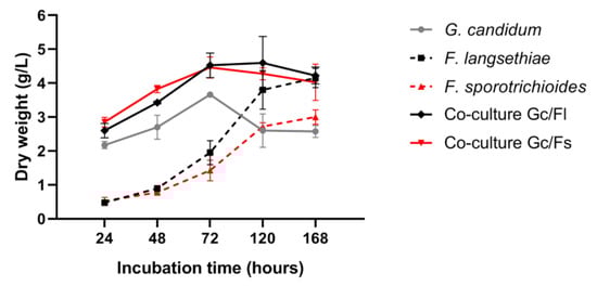Microbial dry weight analysis in control cultures (G. candidum, F. langsethiae 2297 and F. sporotrichioides 186 alone) and in co-culture experiments (G. candidum with F. langsethiae 2297 and G. candidum with F. sporotrichioides 186).