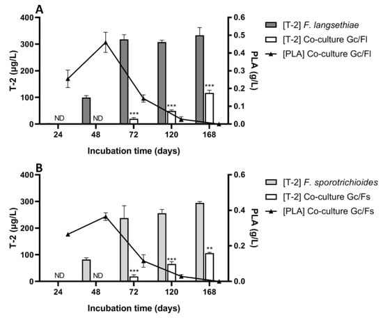 T-2 concentration (µg/L) and phenyllactic acid (PLA) concentration (g/L) in co-culture experiments. Panel A: Co-culture experiment of G. candidum and F. langsethiae 2297. Panel B: Co-culture experiment of G. candidum and F. sporotrichioides 186 (One-way ANOVA, Tukey’s multiple comparisons post-hoc test, ** p-value < 0.01; *** p-value < 0.001) ND = not detectable.