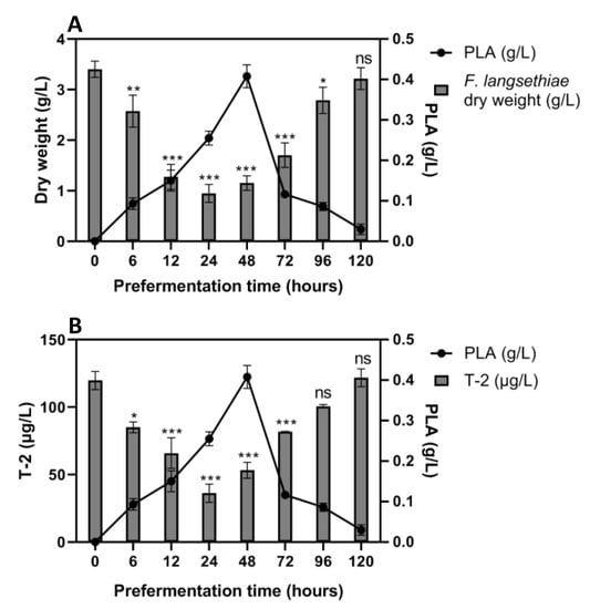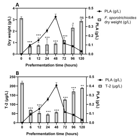 Sequential culture of F. sporotrichioides 186 inoculated in pre-fermented medium by G. candidum and incubated for 7 days at 22 °C. Panel A: Dry weight of F. sporotrichioides 186 (g/L) in comparison with PLA concentration (g/L). Panel B: T-2 concentration (µg/L) in comparison with PLA concentration (g/L). One-way ANOVA, Dunnett multiple comparisons post-hoc test, * p-value < 0.05; ** p-value < 0.01; *** p-value < 0.001; ns = not significant).