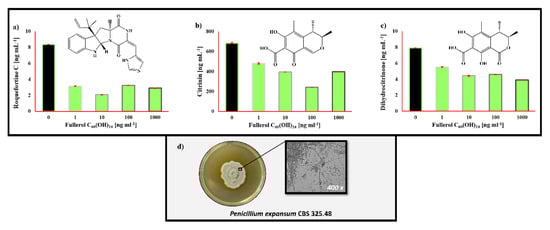 - Kovač, T.; Šarkanj, B.; Klapec, T.; Borišev, I.; Kovač, M.; Nevistić, A.; Strelec, I. Fullerol C60(OH)24 nanoparticles and mycotoxigenic fungi: A preliminary investigation into modulation of mycotoxin production. Environ. Sci. Pollut. Res. 2017, 24, 16673–16681. [Google Scholar] [CrossRef]