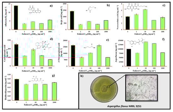 - Kovač, T.; Borišev, I.; Crevar, B.; Čačić Kenjerić, F.; Kovač, M.; Strelec, I.; Ezekiel, C.N.; Sulyok, M.; Krska, R.; Šarkanj, B.; et al. Fullerol C60(OH)24 nanoparticles modulate aflatoxin B1 biosynthesis in Aspergillus flavus. Sci. Rep. 2018, 8, 12855. [Google Scholar] [CrossRef] [PubMed]