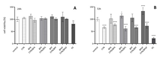 Cell viability was studied after 24 and 72 h exposure of HepG2 cells to CYN, the BPs, and combinations thereof. ET (30 μg/mL) was used as a positive control. Cell viability was evaluated using the MTS tetrazolium reduction assay, as previously described by Hercog et al. [46]. Three independent experiments were performed, with five replicates per treatment point.