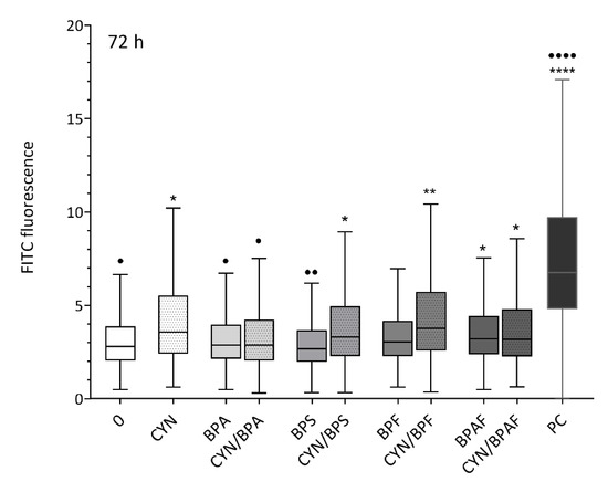 The effect of single compounds and binary mixtures of CYN (0.5 µg/mL) and BPs (BPA, BPS, BPF, BPAF; 10 µg/mL) on the induction of γ-H2AX formation (a sensitive marker for DNA double-strand breaks (DSBs)) in HepG2 cells after 72 h of exposure, using flow cytometry. The data are presented as quantile box plots. The edges represent the 25th and 75th percentiles, the solid line through the box is the median, and the error bars represent 95% confidence intervals. The solvent control (0 = 0.05% methanol and 0.04% DMSO) and a positive control (Etoposide ET, 1 μg/mL) were included in the experiment. The asterisks (*) denote statistically significant difference between solvent control and treated cells (* p ≤ 0.05; ** p ≤ 0.01; **** p ≤ 0.0001). The dots (•) denote a statistically significant difference between CYN alone and CYN/BPs treated cells (• p ≤ 0.05; •• p ≤ 0.01; •••• p ≤ 0.0001).
