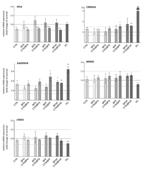 Deregulations of crucial DNA damage response genes (TP53, MDM2, GADD45A, CDKN1A), which were analyzed in the present study (Figure 4) are considered as molecular markers of genotoxic and carcinogenic stress [78,79,80,81,82]. The protein P53 plays a central role in the major DNA damage response pathways: the regulation of DNA damage repair, cell cycle progression, senescence, differentiation, and apoptosis [83]. In response to DNA damage, P53 protein is predominantly activated through its phosphorylation by DNA damage responsive kinases and, to a lesser extent, through the up-regulation of gene expression [84]. The expression of the tumor-suppressor gene, TP53, was not significantly altered by BPs exposure, whereas it was slightly (<1.5-fold) down-regulated by CYN and the CYN/BPs combinations. Previous studies on the expression of the TP53 gene reported that CYN [18,25,27] and BPs [46] did not influence TP53 expression in HepG2 cells. Our results indicate that the combined exposure to CYN/BPs does not affect the expression of this gene differently than exposure to CYN as a single compound.
