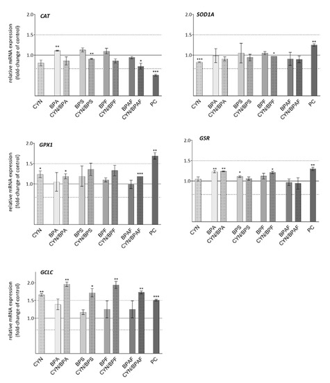 The influence of single compounds and CYN/BPs binary mixtures on oxidative stress induction in HepG2 cells was evaluated by analyzing the deregulation of selected oxidative stress response genes. One of the possible mechanisms of CYN genotoxicity is postulated to be the formation of reactive oxygen species (ROS) that can induce DNA damage. However, the published data are not consistent. While there are studies reporting increased ROS formation by CYN in various test systems, oxidative damage was observed rarely (for a review see: [20,23]).