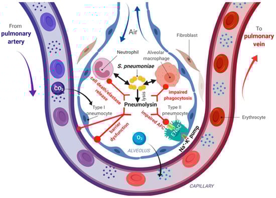 Through its cytotoxic, barrier-disruptive, and complement-activating properties, PLY participates in the pathogenesis of ALI and promotes bacteremia [332]. PLY’s lytic pores may cause alveolar hemorrhage and dissemination of alveolar microorganisms into the bloodstream [338,339,340,341]. PLY has also cytotoxic properties, as it can causes caspase 6-dependent apoptosis in lung epithelium and capillary endothelium [338,339]. Interestingly, different immune cells were shown to exert differential sensitivity to the pore-forming-induced cytotoxic activities. As such, T cells were shown to be highly susceptible, whereas alveolar macrophages are more resistant [342]. Plasma membrane damage caused by cytolysin-induced pore formation can however be repaired through a mechanism involving Ca2+-activated lipid scramblase TMEM16F, which in turn promotes repair by enhancing membrane fluidity and the release of extracellular vesicles carrying damaged membranes [343].