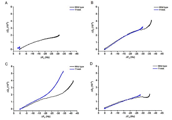 In addition, ΔD-ΔF plots can be used to compare the binding behavior between the WT and the mutant T144A. For binding onto POPC bilayers (Figure 2A), the ΔD-ΔF signal for the T144A remained mostly constant with increasing time, while the WT showed a proportional increasing of ΔD and ΔF. However, the WT and the T144A seemed to bind in a similar way onto 1:0.4 POPC/Chol and 1:1:1 SM/POPC/Chol bilayers (Figure 2B,D), suggesting similar viscoelastic properties. On the contrary, a different trend occurred for the binding onto 1:1 SM/POPC bilayers (Figure 2C). It can be observed that for the same frequency change (ΔF) the mutant induced a final less rigid protein-lipid layer.