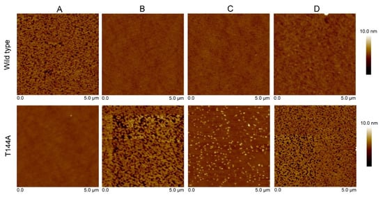 Atomic force microscopy (AFM) height images showing the interaction of the Cyt2Aa2 WT and the T144A mutant with the different lipid bilayers. First, the lipid bilayers were formed on silica surfaces. After, both protein solutions (WT and mutant) were exposed to the lipid bilayers for 30 min. The AFM images were collected in tapping mode with a scan rate of 1–2 Hz. Note that the scan size of every image is 5 µm × 5 µm. The vertical scale (until 10 nm) is indicated on the right. Image processing was carried out with the Nanoscope program. (A) POPC, (B) 1:0.4 POPC/Chol, (C) 1:1 SM/POPC, and (D) 1:1:1 SM/POPC/Chol bilayers.