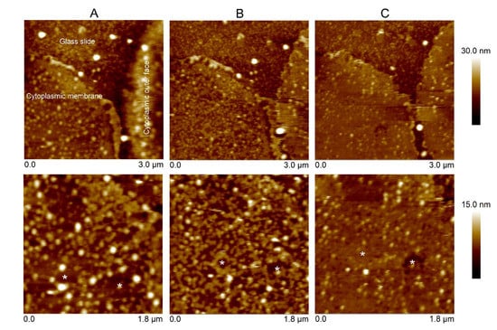 AFM images of Cyt2Aa2 toxin binding on the erythrocyte membrane. The erythrocyte membrane was prepared on a lysine-coated glass (A). The cell membranes were initially exposed to the T144A mutant (25 µg/mL) for 2 h (B). After buffer rinsing, the Cyt2Aa2 wild type solution (25 µg/mL) was exposed to the same membrane for 1 h (C). The topographic images were collected in tapping mode at a scan rate of 1–2 Hz. The images were analyzed with the Nanoscope program. The images have a scan size of 3 µm × 3 µm (upper panel) and 1.8 µm × 1.8 µm (lower panel). Note that the vertical scale differs: from 0 to 30 nm (upper panel), and from 0 to 15 nm (lower panel). The white asterisks mark the same areas on the erythrocyte membrane.