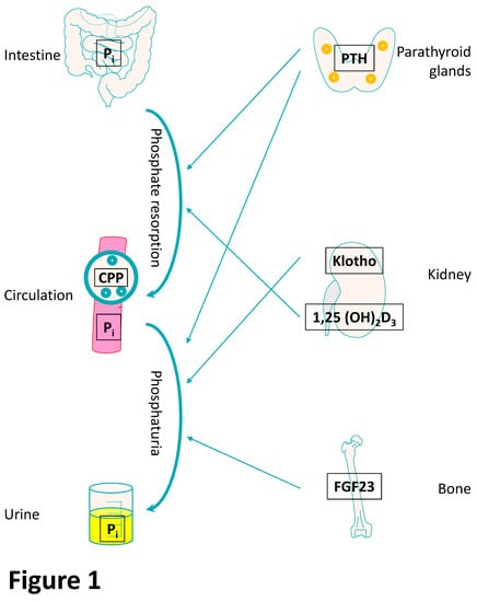 - Jacquillet, G.; Unwin, R.J. Physiological regulation of phosphate by vitamin D, parathyroid hormone (PTH) and phosphate (Pi). Pflügers Arch. Eur. J. Physiol. 2019, 471, 83–98. [Google Scholar] [CrossRef]