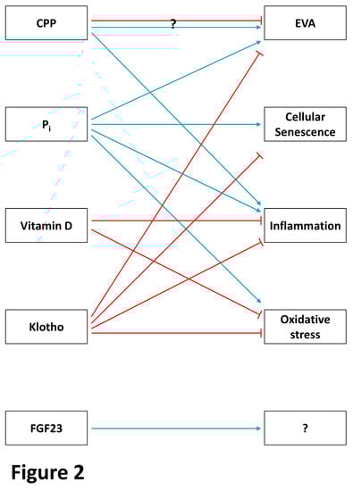 Phosphate induces EVA via different mechanisms, and higher serum Pi concentrations, even if they are within the normal range, have been found to be associated with microvascular dysfunction in a Dutch, population-based cohort study [74] (Figure 2). In human aortic VSMC, Pi treatment arrests the cell cycle [75], mediating cellular senescence. In vitro, Pi further induces vascular calcification and production of ROS [76]. Mediated by Ca-Pi crystals and a disturbed microRNA homeostasis, Pi has additional indirect and negative effects on EVA [77]. Importantly, these in vitro data on EVA are supported by a Scottish general population study showing that Pi is linked to markers of biological age, that is, reduced telomere length, DNA methylation content, and chronological age [78].