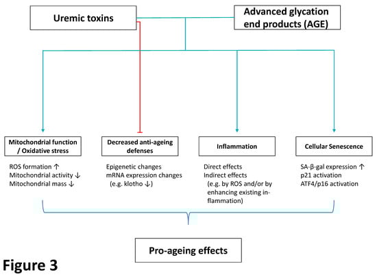 Taken together, uremic toxins, including AGE, have distinct and adverse effects on the pro- and anti-oxidative milieu, mitochondrial function, inflammation, and finally cellular senescence; all of which are hallmarks of the ageing process [45] (Figure 3).