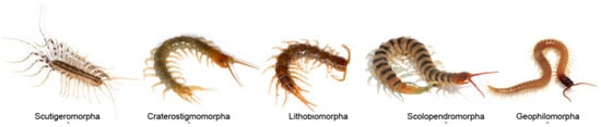 - Edgecombe, G.D.; Giribet, G. Evolutionary biology of centipedes (Myriapoda: Chilopoda). Annu. Rev. Entomol. 2007, 52, 151–170. [Google Scholar] [CrossRef]