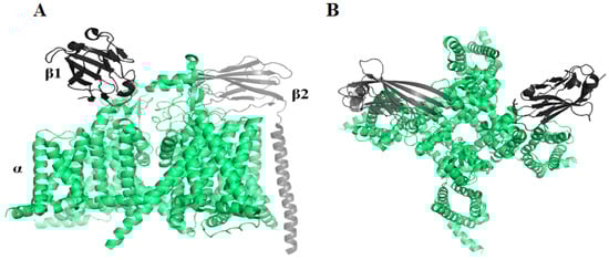 (A) The side view of Nav1.7 (PDB ID: 6J8I [67]) containing one α subunit and two β subunits. (B) The Nav1.7 structure from a top-down view of the tetrameric channel.