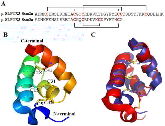 (A) The sequences of µ-SLPTX3-Ssm2a and µ-SLPTX3-Ssm3a. (B) The structure of µ-SLPTX3-Ssm2a (PDB ID: 2MUN [66]). The cysteine pairs forming disulfide bonds are labeled and shown in stick representation. (C) Overlay of µ-SLPTX3-Ssm2a (dark blue) and Ta1a (red, PDB ID: 2KSL [66]). The disulfide bonds are shown in stick representation.