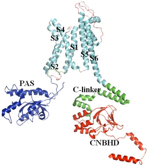 Kv channels are transmembrane channels specific for potassium. There are 12 members of the Kv channel family, Kv1–Kv12. Most are homogeneous tetramers, and each subunit is comprised of six transmembrane segments S1–S6 (Figure 4). Segments S1–S4 form the voltage sensor (VS) that activates upon membrane depolarization. The movement of VS is coupled to the K+ selective pore (S5–S6) by a helical S4–S5 linker [70]. The Eag family, which includes Kv10–Kv12, contains three intracellular domains, an N-terminal Per-ARNT-Sim (PAS) domain, a C-terminal C-linker domain, and a C-terminal cyclic nucleotide binding homology domain (CNBHD). The PAS domain is also important in gating.