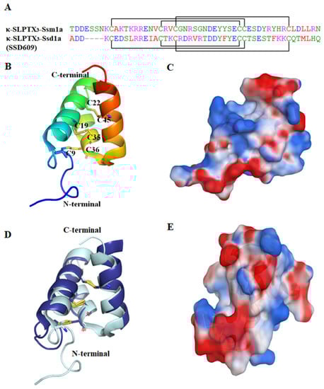 The sequence and structure of κ-SLPTX3-Ssm1a (PDB ID: 2M35) and SSD609 (PDB ID: 2MVT [44]). (A) The sequences of κ-SLPTX3-Ssm1a and SSD609. The cysteine pairs forming disulfide bonds are connected with square brackets. (B) The cartoon structure of κ-SLPTX3-Ssm1a (PDB ID: 2M35). The four cysteine residues are shown in stick representation. (C) The electrostatic surface of κ-SLPTX3-Ssm1a. (D) Overlay of κ-SLPTX3-Ssm1a (light cyan) and SSD609 (dark blue). (E) The electrostatic surface of SSD609. The positive and negative electrostatic potential was shown in blue and red, respectively.