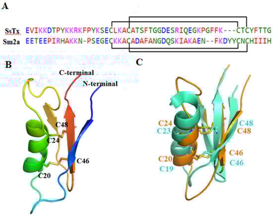 The structure of SsTx (PDB ID: 5X0S) was recently elucidated by Luo et al. (Figure 6) [45]. SsTx has two disulfide bonds between C20-C46 and C24-C53 [46]. It adopts a novel structural arrangement called 2ds-CSα/β, which consists of an α-helix connected to a β-sheet by two disulfide bonds (CSα/β) [77]. The 3D structure of SsTx is similar to that of U-SLPTX15-Sm2a, which is a centipede peptide without antimicrobial activity, Kv activity, Nav activity or Cav activity [45].