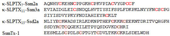 ω-SLPTX5-Ssm1a has a molecular mass of 8810.4 Da and was identified in Scolopendrinae [7,43]. It comprises 86 amino acid residues (Figure 9). This peptide is special because it contains an odd number of cysteine residues. Six of the seven cysteines form three intramolecular disulfide bonds. ω-SLPTX5-Ssm1a shares sequence homology with three centipede toxins, U-SLPTX5-Sa1a, U-SLPTX5-Er3a and U-SLPTX5-Er2a, with sequence identities of 82%, 47.5% and 43.2%, respectively. ω-SLPTX5-Ssm1a acts as an activator of Cav channels in DRG neurons. It was reported that 1 μM ω-SLPTX5-Ssm1a increased CaV currents in DRG neurons by 70%, whereas 10 μM ω-SLPTX5-Ssm1a increased Cav currents by 120% [43].