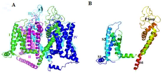 The structure of the α1 subunit of rabbit Cav1.1 (PDB ID: 6BYO [83]). (A) The cartoon is colored by domain. (B) Structure of domain I.