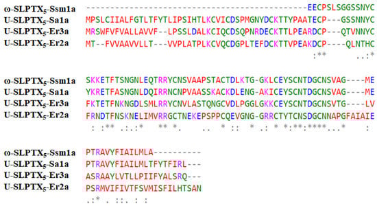 Sequence alignment of ω-SLPTX5-Ssm1a with three homologous peptides.