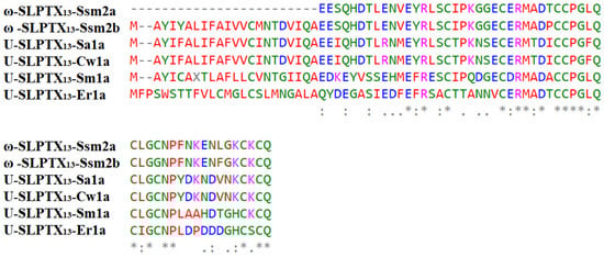 Sequence alignment of ω-SLPTX13-Ssm2a with its homologous peptides.
