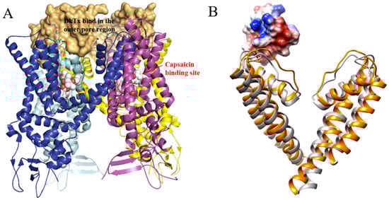 The structure of polymodal transient receptor potential vanilloid 1 (TRPV1). (A) The crystal structure of TRPV1 tetramer binding with the spider peptide toxin DkTx. The cartoon is colored by TRPV1 subunits. The molecular surface in orange represents DkTx, which is bound to the outer pore region. (B) A docking model of TRPV1 monomer (orange ribbon) bound with centipede toxin RhTx (surface) by Yang et al. [49]. TRPV1 in the closed state (grey ribbon) was overlaid to the model.