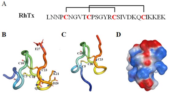 (A) The sequence of RhTx. The cysteine pairs forming disulfide bonds are connected with square brackets. (B) and (C) Two representative conformations of RhTx (PDB ID: 2MVA). The key residues are labeled and shown in stick representation. (D) The electrostatic surface of RhTx. The positive and negative electrostatic potential was shown in blue and red, respectively.