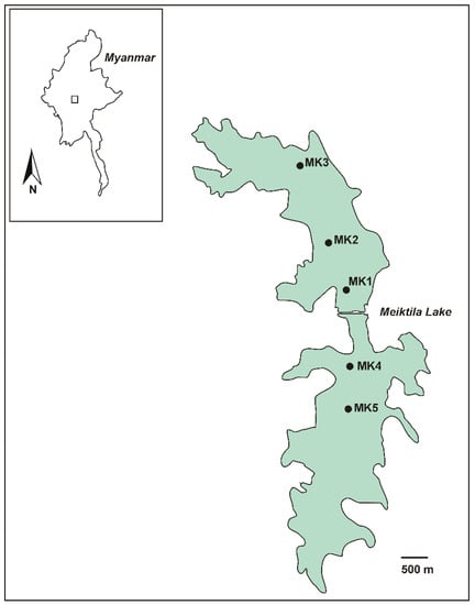 Meiktila Lake is a shallow reservoir, located close to Meiktila city in central Myanmar in the Mandalay region at an altitude of 230 m (Figure 1). During the rainy season, from April/May to October/November, it receives water from Mondaing Dam, located ca. 15 km west of Meiktila at an altitude of 245 m. Depending on the season, Meiktila Lake covers an area of around 54 km2 with a maximum water depth of 10 m. It is divided by a dam into a northern and a southern lake [5]. Five sampling points were selected, three in the northern part of Meiktila Lake and two in the southern part (Figure 1, Table 5).