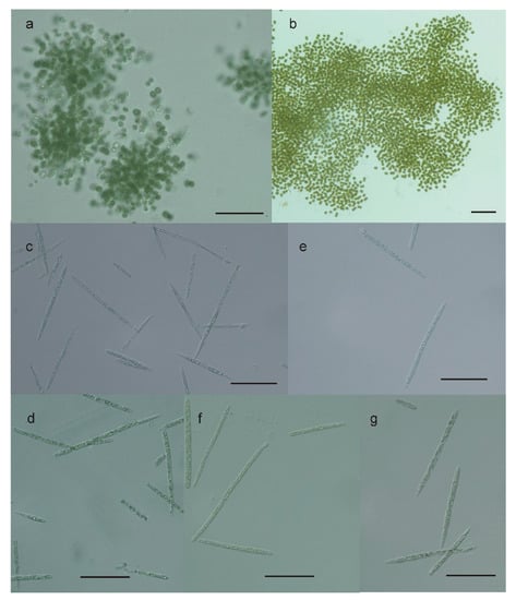 Micrographs of cyanobacteria investigated in this study. (a) Microcystis novacekii (AB2017/14); (b) Microcystis aeruginosa (AB2017/15); (c) Raphidiopsis raciborskii (AB2017/05); (d) Raphidiopsis raciborskii (AB2017/09); (e) Raphidiopsis raciborskii (AB2017/12); (f) Raphidiopsis raciborskii (AB2017/13); (g) Raphidiopsis raciborskii (AB2017/16). Scale bars indicate 50 µm.