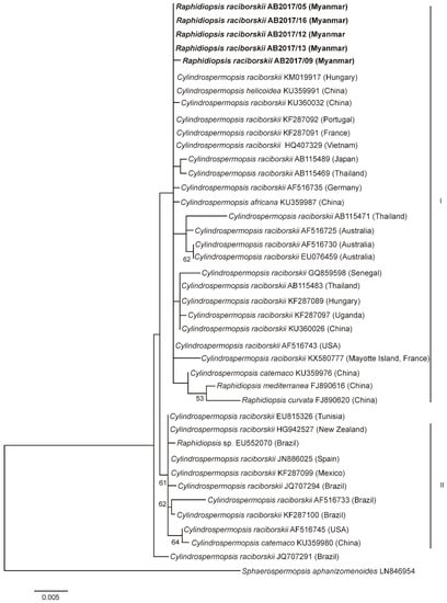 ML tree based on partial 16S rRNA gene sequences of 40 Raphidiopsis/Cylindrospermospis strains. Outgroup = Sphaerospermopsis aphanizomenoides (LN846954). Cluster I includes Cylindrospermopsis and Raphidiopsis strains from Asia, Europe, Africa, Australia and North America, cluster II includes strains from North and South America (USA, Mexico, Brazil), North Africa (Tunisia), Southwest Europe (Spain) and New Zealand. Strains from this study are marked in bold. Bootstrap values above 50 are included. The scale bar indicates 0.5% sequence divergence.